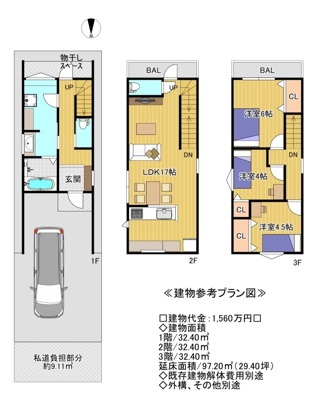 ≪建物参考プラン図:1階32.40平米、2階32.40平米、3階32.40平米、延床面積97.20平米◇建物代金:1,560万円◇既存建物解体費用別途◇外構・その他別途≫