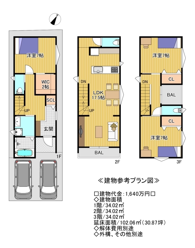 ≪建物参考プラン図:1階34.02平米、2階34.02平米、3階34.02平米、延床面積102.06平米◇建物代金:1,640万円◇解体費用別途◇外構・その他別途≫