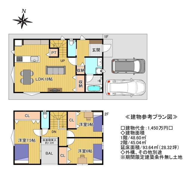 期間限定の建築条件なしの土地です◎お好きなハウスメーカー・工務店で建築可能です♪お気軽にお問合せ下さい!! ≪建物参考プラン図:1階48.60平米、2階45.04平米、延床面積93.64平米◇建物代金:1,450万円◇外構・その他別途≫